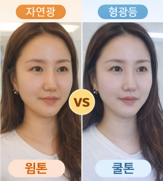 예를 들어 노란 조명에서는 웜톤이 더 강조되고, 형광등 아래에서는 피부가 쿨톤처럼 보일 수 있습니다.